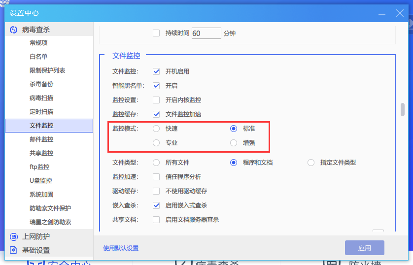 建议文件监控只设置极速就行了,设置标准及以上都会对系统性能造成很大的影响,别问我怎么知道的