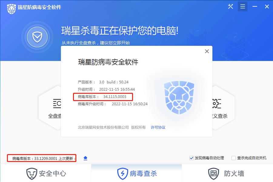 打开主程序,点击升级,刚升级完,主界面左下角 病毒库版本不会马上变,关闭主程序再打开,就显示正常了,不知算不算BUG