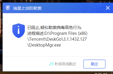今天测了下发现了一个问题,我平常为了方便桌面文件分类我会常开腾讯桌面整理功能,今天开机发现桌面都是类似瑞星之剑的文件诱饵,然后尝试的删除了一下,里面弹出了阻止窗口,点击拒绝后桌面整理功能被强制关闭,然后再去打开桌面整理时已经报错无法再次打开,我估计是瑞星把桌面整理判定为了病毒所以删除了,这个问题也蛮尴尬的,具体版本号和截图我上传上来。