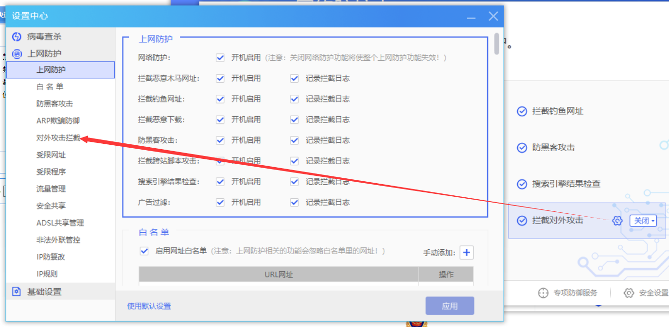 2.点击拦截对外攻击后面的小齿轮后弹出的设置中心定位错误,应当定位到箭头指向处,现在定位到上网防护了。另外界面上名字应该和设置中心统一。