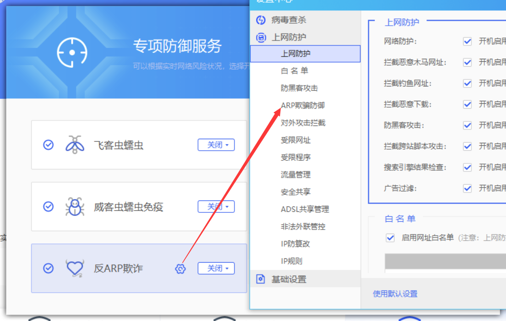 3.这个和第2点一样,专项防御里点击反arp欺骗后面的小齿轮后弹出的设置中心定位错误,应当定位到箭头指向处,现在也是定位到上网防护了。界面上名字和设置中心不统一。