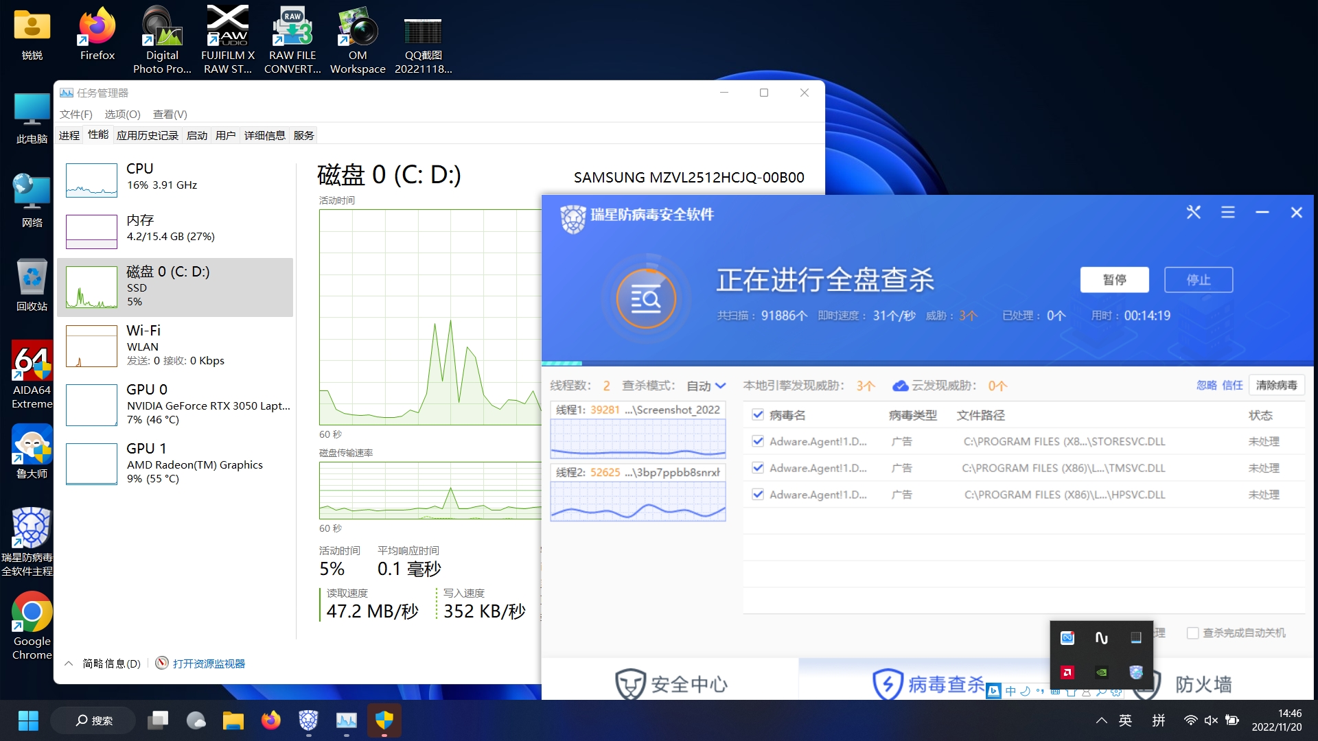 碰到单反的RAW格式文件和CAD的文件就减速了,没看到扫描文件有400/s过,在11系统下扫个文件1292360个居然用了3小时,10系统下2174067个文件用了用了4小时,也显示成用时41分钟,日志记录不太准,在8.1系统下更新和安装是很慢的,扫描日志里时间显示不准,出现了用时-1,每次更新病毒库后FTP监控是自己关闭。明显11系统的优化支持做的还不太行或者说AMD多核优化做的还不行。当友商的云引擎,AI引擎做的火热是,瑞星的真的落后了好多啊,起不到加速。UI中可以像V17一样把引擎辨识出来的,这个界面我都不知道我本地引擎开了那些引擎,有没有漏开的,引擎是模块化的话有没有引导用户开启全部引擎。在11系统要多优化下,安装后明显感觉有点卡顿了,而且风扇时不时就加大散热,没安装瑞星时不会这样。全盘扫描时还是要调整下。暂时先这些,我再继续用用,还有安装后笔记本电池出现明显不耐用的情况,是后台时不时在扫描吗?