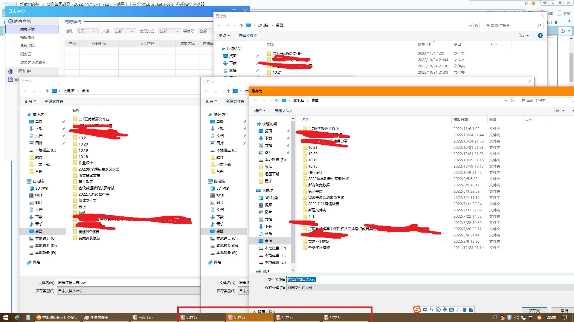 2、这时把日志中心关闭,会在桌面生成病毒详情日志文件,但是这个文件没有后缀名,无法打开。同时,另存为的对话框并不会关闭。