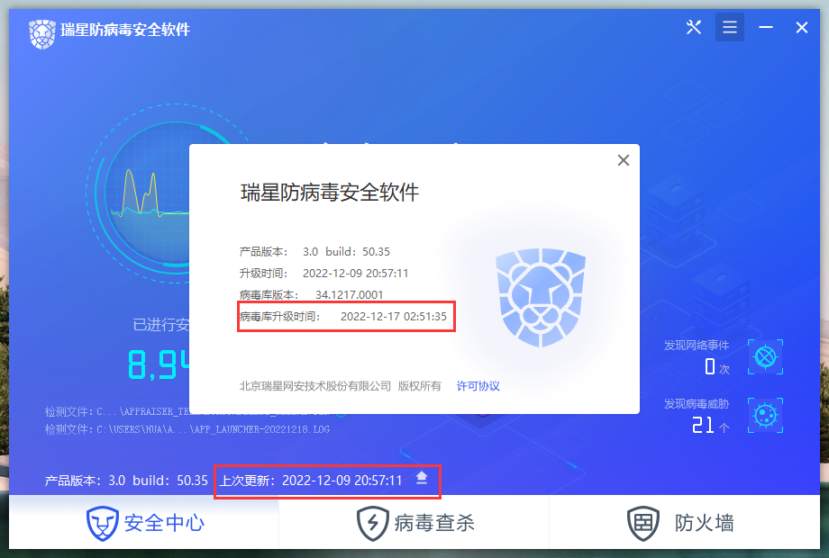 问题现象: 程序主界面的“上次更新”时间,建议修改为病毒库的更新时间,目前这种展现形式,会让用户产生病毒库已经很久不更新的错觉
