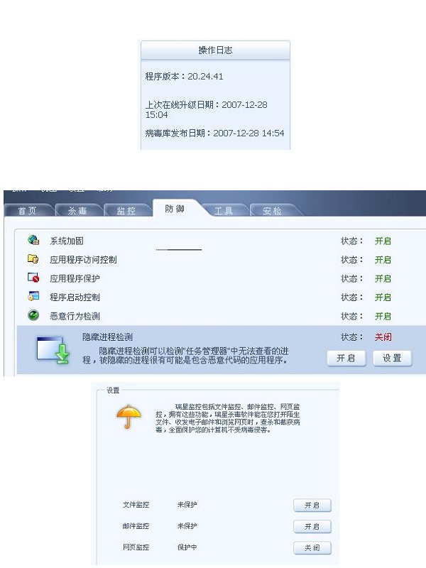 2007.12.28自动升级后,监控绿色雨伞变成黄色,修复安装后正常,绿色雨伞,但1分钟后,瑞星提示监控没有全部打开变成黄伞.点击"开启"没有反应.