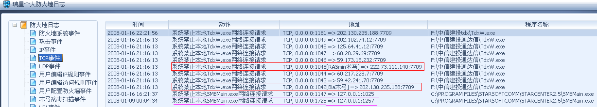 我安装中信建投证券通达信版后用瑞星查过,没有提示有病毒。但双击通达信图标时,瑞星防火墙弹出的提示窗口中有木马的字。下边是截图,我一个月前在另外一个机上安装中信建投大智慧时也有这个。