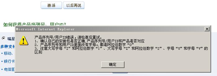 我是2008-2-12用手机支付购买的30元一年的序列号和ID号,跟你情况一样,不知如何处理,瑞星这么大的公司我想不能不给解决吧?客服电话打不进去,总是忙,真的希望瑞星能尽快给以解决,
