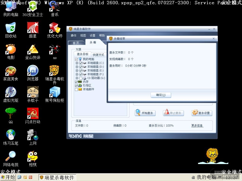 一点杀毒,立刻就结束,并示显:0分0秒,查杀文件0个