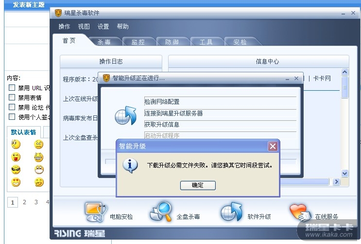 7月10日再次升级,同样显示下载失败。郁闷非常,于是全部卸载瑞星重装,完毕之后,还是防火墙能够正常升级,杀毒软件再次显示“下载升级必须文件失败,请你换其他时间段尝试”,我崩溃了! 跪求高人,造成这种状况是什么原因,如何解决?万分感谢