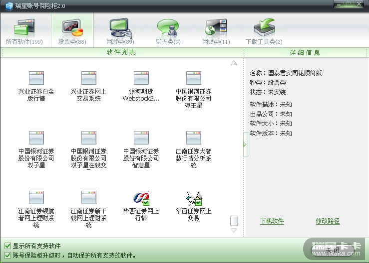 我电脑是Vista 系统,装有大智慧和华西证券两个股票软件,瑞星账号保险柜的“股票类”能检测到大智慧,但却检测不到华西证券。我选中下面的“显示所有支持软件”发现里面有“华西证券网上行情”和“华西证券网上交易”,但就是检测不到。