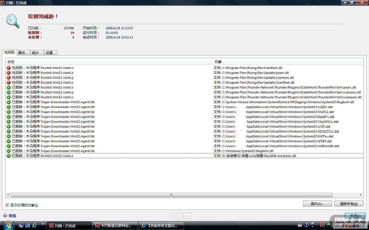本人在单位(xp系统)和家里(vista系统)都是用的正版瑞星杀软。在单位浏览网页时瑞星偶尔会报毒,但在家里瑞星自从安装上后,重来没有报过毒。特别是有一次在家里从网上下载了一个游戏外挂(这个外挂肯定有毒的),瑞星也未能查出。最后从网上找了个卡巴,查出14个木马病毒来。现在都不敢在vista系统下使用瑞星了。 瑞星杀毒软件在vista系统下究竟如何?