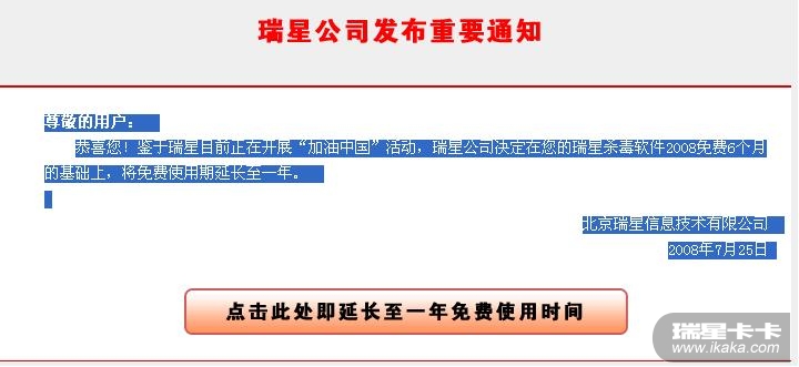 恭喜您!鉴于瑞星目前正在开展“加油中国”活动,瑞星公司决定在您的瑞星杀毒软件2008免费6个月的基础上,将免费使用期延长至一年。