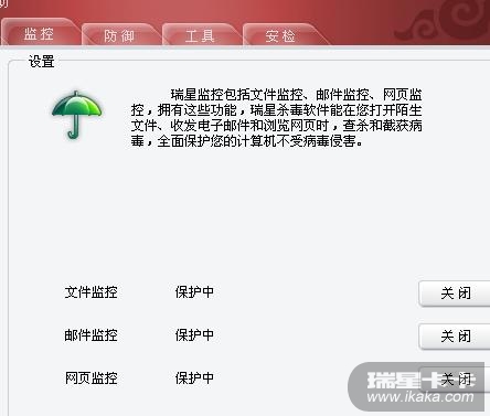 很多时候是病毒关闭了监控,这时候需要升级瑞星全盘杀毒,或者是配合瑞星提供的专杀来杀毒,最后的方法就是扫描听诊器信息上报瑞星分析,或者是在论坛里扫描sreng日志来分析处理