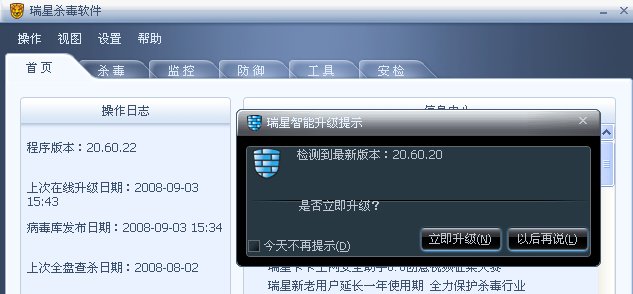 发现瑞星自动升级,但发现更新的版本低于现用的版本,为什么?