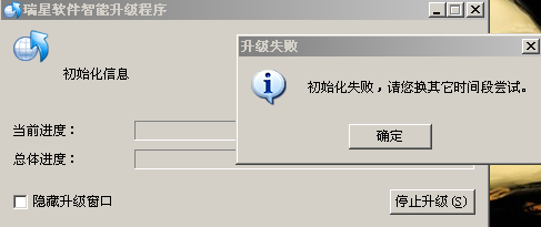 回复:我的是瑞星07正版的,现在一直"初始化失败,请您换其他时间段尝试"