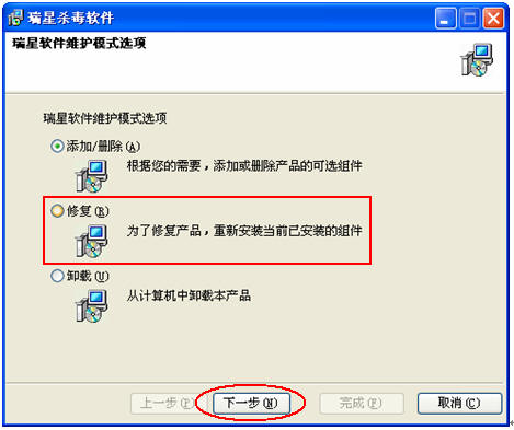 单击Windows桌面【开始】/【所有程序】/【瑞星杀毒软件】/【添加删除组件】,显示【瑞星软件维护模式选项】窗口,选中【修复】,按“下一步”,根据提示操作即可。