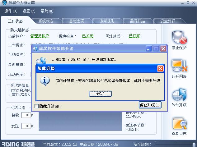 今天重新装的系统,所有盘全部格式化了,瑞星防火墙和杀毒软件装上以后,可以升级,升级完以后总是说已经是最新版本,不用升级,但关键升级了以后不是最新版,我用的是瑞星杀毒软件2008单机版的