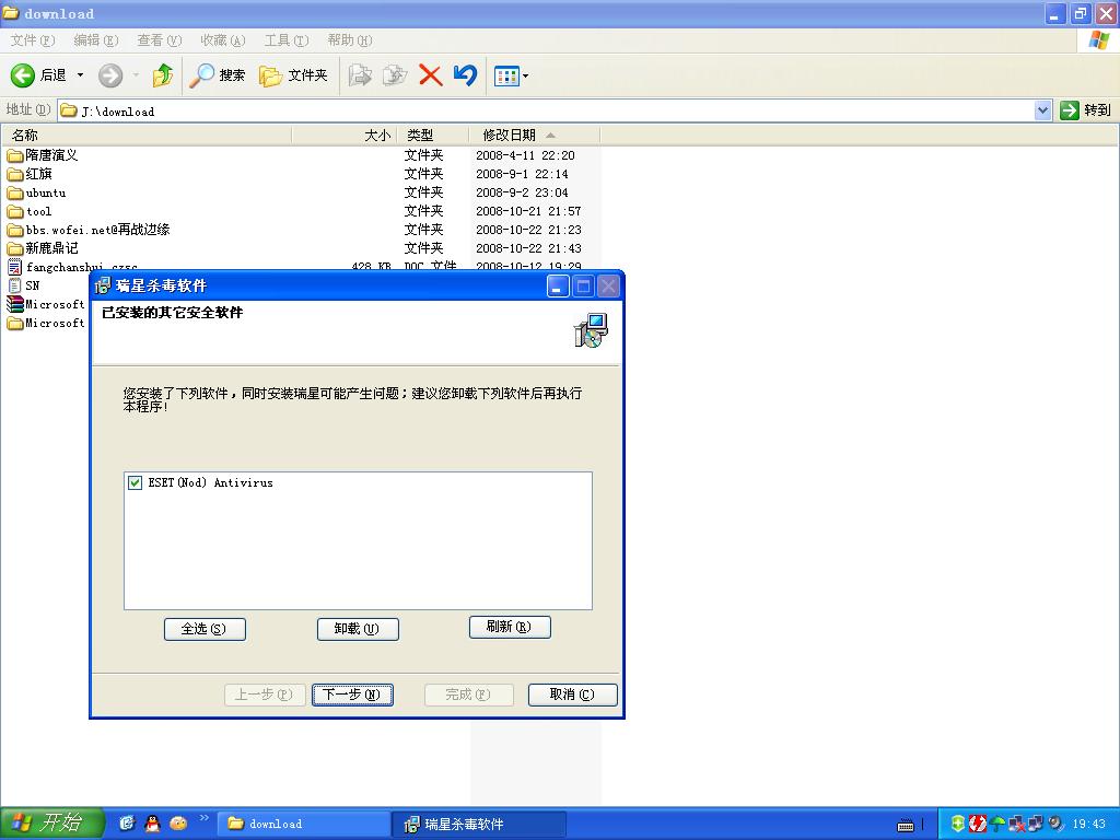 哪个不是诺顿,是ESET(nod)。lz的瑞星是什么版本。要卸载nod在控制面板里查看是否有nod程序。