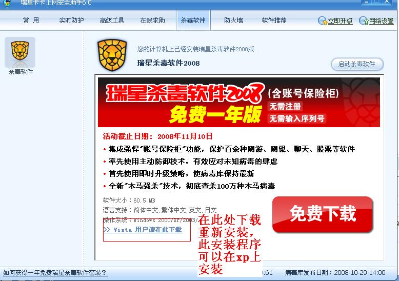 回复:我已经下载卡卡,为什么安装不了瑞星杀毒软件和防火墙等?