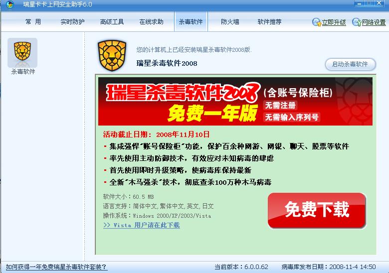 回复:瑞星卡卡下载的免费瑞星杀毒软件为什么不能装?!