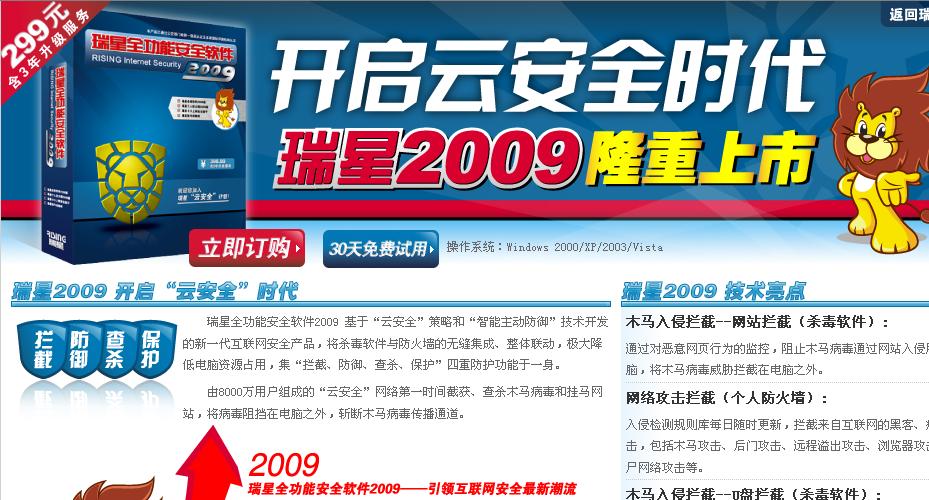 瑞星全功能安全软件2009 基于“云安全”策略和“智能主动防御”技术开发的新一代互联网安全产品,将杀毒软件与防火墙的无缝集成、整体联动,极大降低电脑资源占用,集“拦截、防御、查杀、保护”四重防护功能于一身。