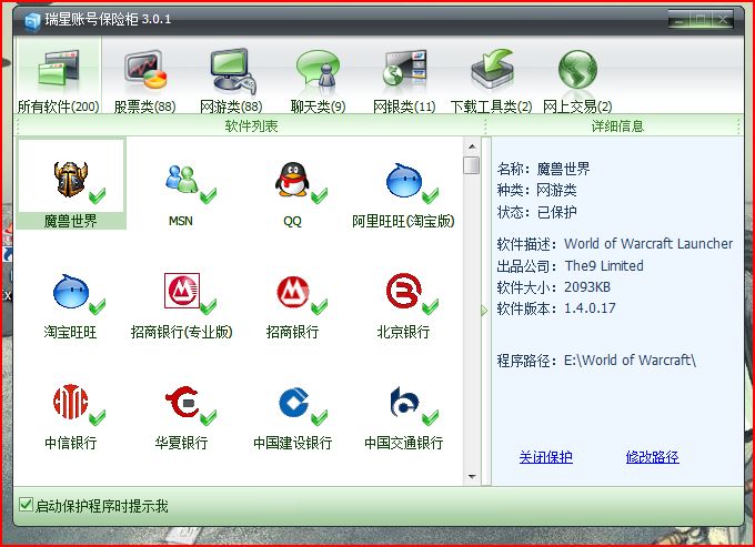 刚升级的瑞星2009,登录了MSN,几个QQ,淘宝旺旺,wow什么的,突然发现没有帐号保护的提示。赶紧退了运行保险柜3.0,这才有帐号保护。那是不是说不手动运行保险柜就没有帐号保护了?以前用帐号保险柜即使不手动运行的话也是有保护的。vista下还没法拖到启动组里,有UAC控制必须输入密码。瑞星这是逼着用户每天登录帐号保险柜,从保险柜里启动各种程序,突出它这个产品!