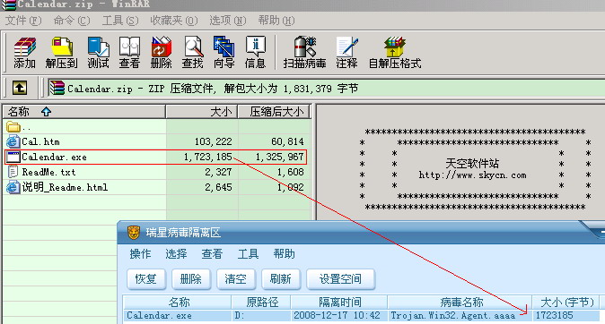 你好。瑞星杀毒软件2009版之21.17.12病毒库,对著名的“日梭万年历2008 Beta1”硬盘版程序Calendar.exe存在误杀。请尽快更正(附作者联系方式:武汉 华中农业大学 刘安国,