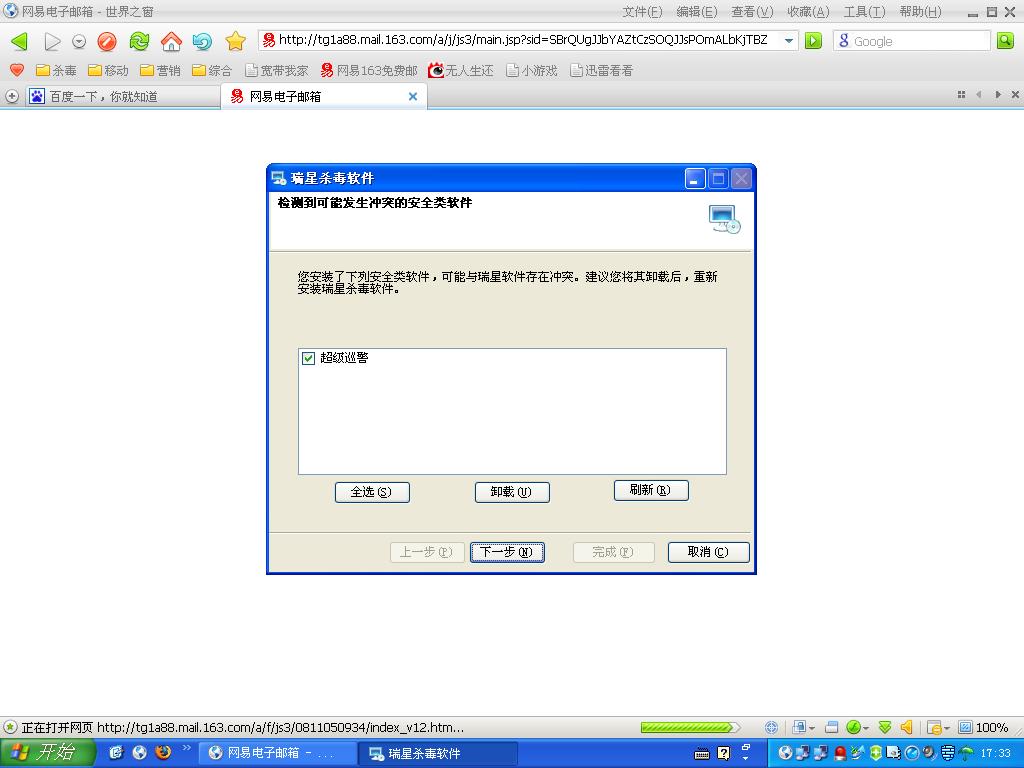 瑞星2009版本进行安装过程中,提示与超级巡警互斥!瑞星要求卸载超级巡警软件!真是郁闷,08版本的瑞星没有该问题!我不想卸载超级巡警!因为超级巡警只是一款辅助杀毒软件啊!