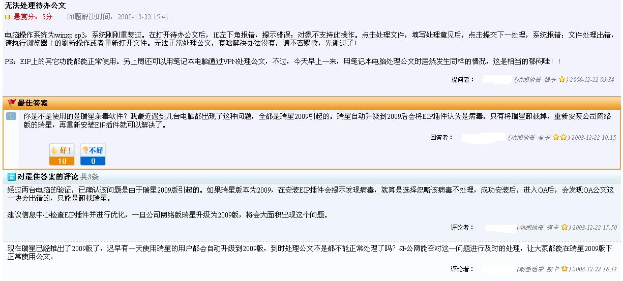 工程师12回复:病毒库版本:21.09.11,不报毒!在升级到最新版后,安装插件时到是不报病毒了,可是OA的公文仍然不能进行处理,IE页面左下角报错。禁用所有的主动防御与实时监控都不行,只有在卸载2009后即恢复正常,安装2008版任意版本也正常。