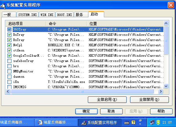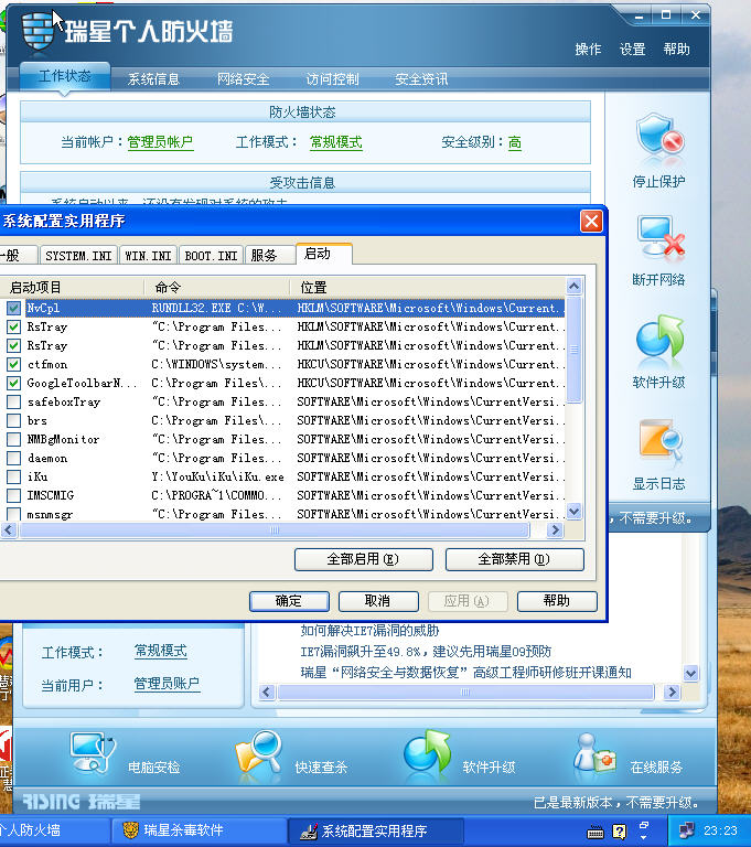 以前是2008,用的好好的,升级到2009后保护伞没有了,个人防火墙也没有了!程序都可以打开,证明没有被病毒入侵,也可以正常升级,登陆系统前也可以看到2个图标,启动项里关于瑞星的都钩了,有时候自动静默升级后要求重启!