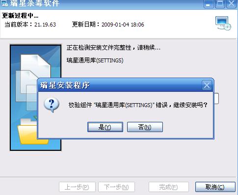 次更新都弹出一个框框:校验组件“瑞星通用库(SETTINGS)”错误,继续安装吗?