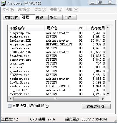 结果我一看资源管理器,哇,scanfrm.exe把我双核的CPU也给烧成了100%,2G内存也受不住这么搞。