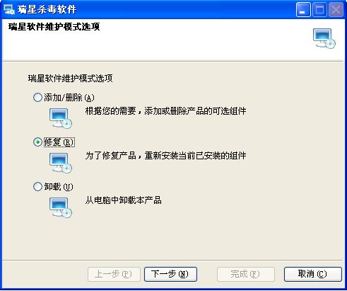 用开始,程序,瑞星杀毒软件,添加删除组件,选修复