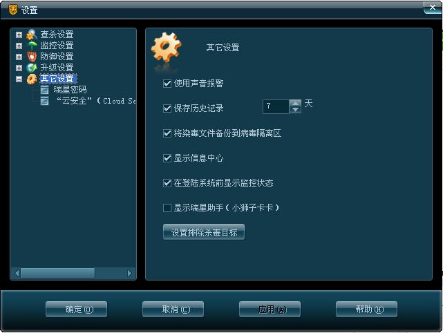 我的狮子可以关闭的啊,设置——其他设置 把 显示瑞星助手(小狮子卡卡) 前面的勾去掉就好了,我的狮子一直没出来……你试试?