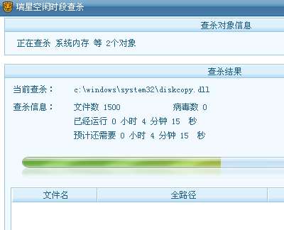 瑞星2009版的空闲时段查杀中已运行时间和预计需要时间一起增加。按照那提示预计需要时间会越来越长,永远没有结束的时候