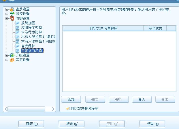 杀软的:主程序--设置--详细设置--防御设置--自定义白名单--添加自己需要加入的程序即可(如图1)