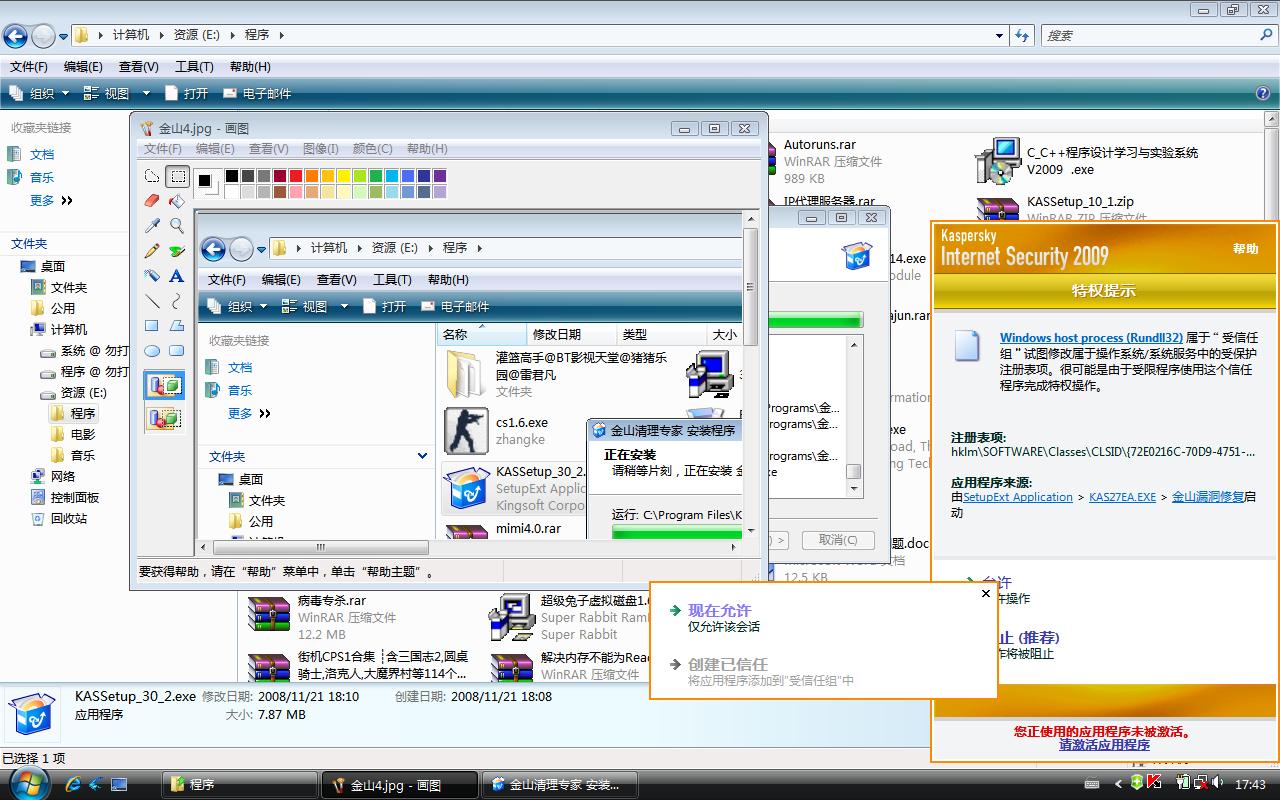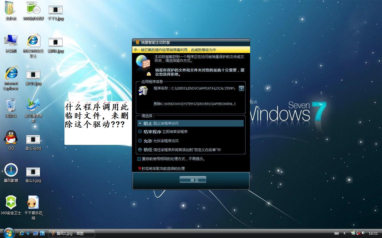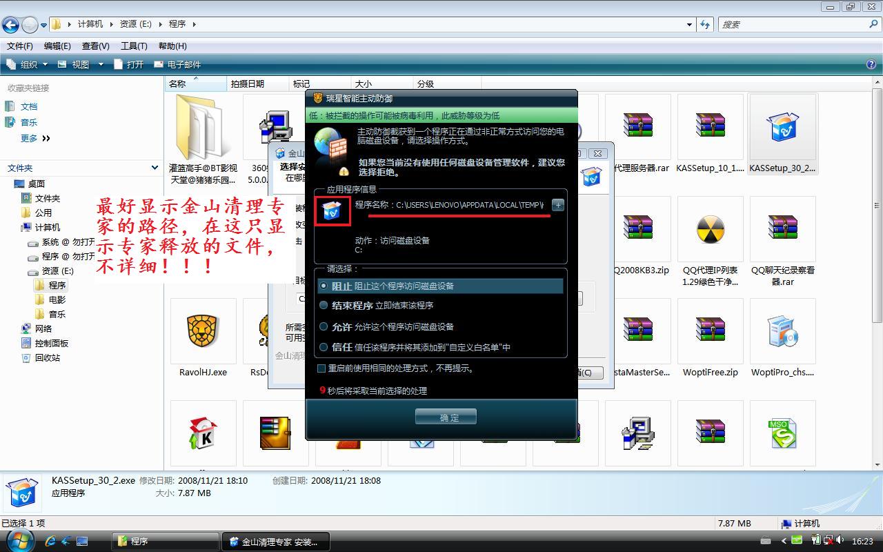 希望瑞星能提示“金山安装程序释放的临时文件,试图访问磁盘!!!”虽然有安装程序的图标,但大多数用户不会注意的,何况还在倒计时(询问窗口)