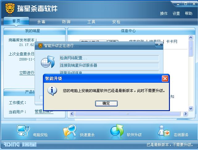 使用的是瑞星2009单机版,病毒库版本是21.17.62.00,2009.02.23瑞星官网上提示最新的病毒库版本是21.26.62,可是我点击杀毒软件窗口上的“软件升级”,升级程序提示“您安装的瑞星杀毒软件已经是版本,此时不需要升级”,点击 开始-所有程序-瑞星杀毒软件-升级程序,仍然是相同的提示,这到底是怎么回事?希望客服回答一下。(PS:产品授权-本产品已完成注册操作)附件上的截图是09.02.23操作的