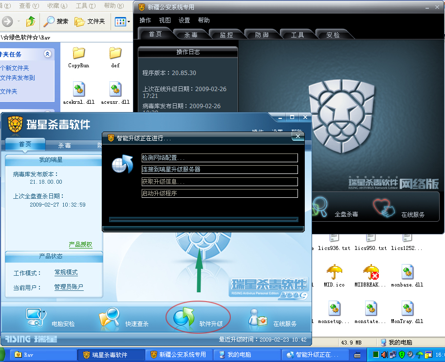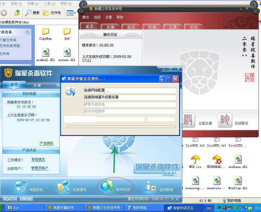1、我的这台电脑安装的是2008版的网络版瑞星,中午我从另外一台电脑拷了2009版的单机版(正式版,已安装)瑞星到电脑里面,这样一来,这台电脑存在两个版本的瑞星,08的安装版跟09的绿色移动版。