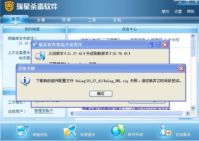 昨天早上我把我的系统重新恢复后,点升级后出现“下载新的组件配置文件RsLag/20-27-42/RsLag-XML.zip失败,请您换其它时间段尝试”从昨天到今天一直都是这样提示。怎么才能升级啊?二天都升不了级了。。。。
