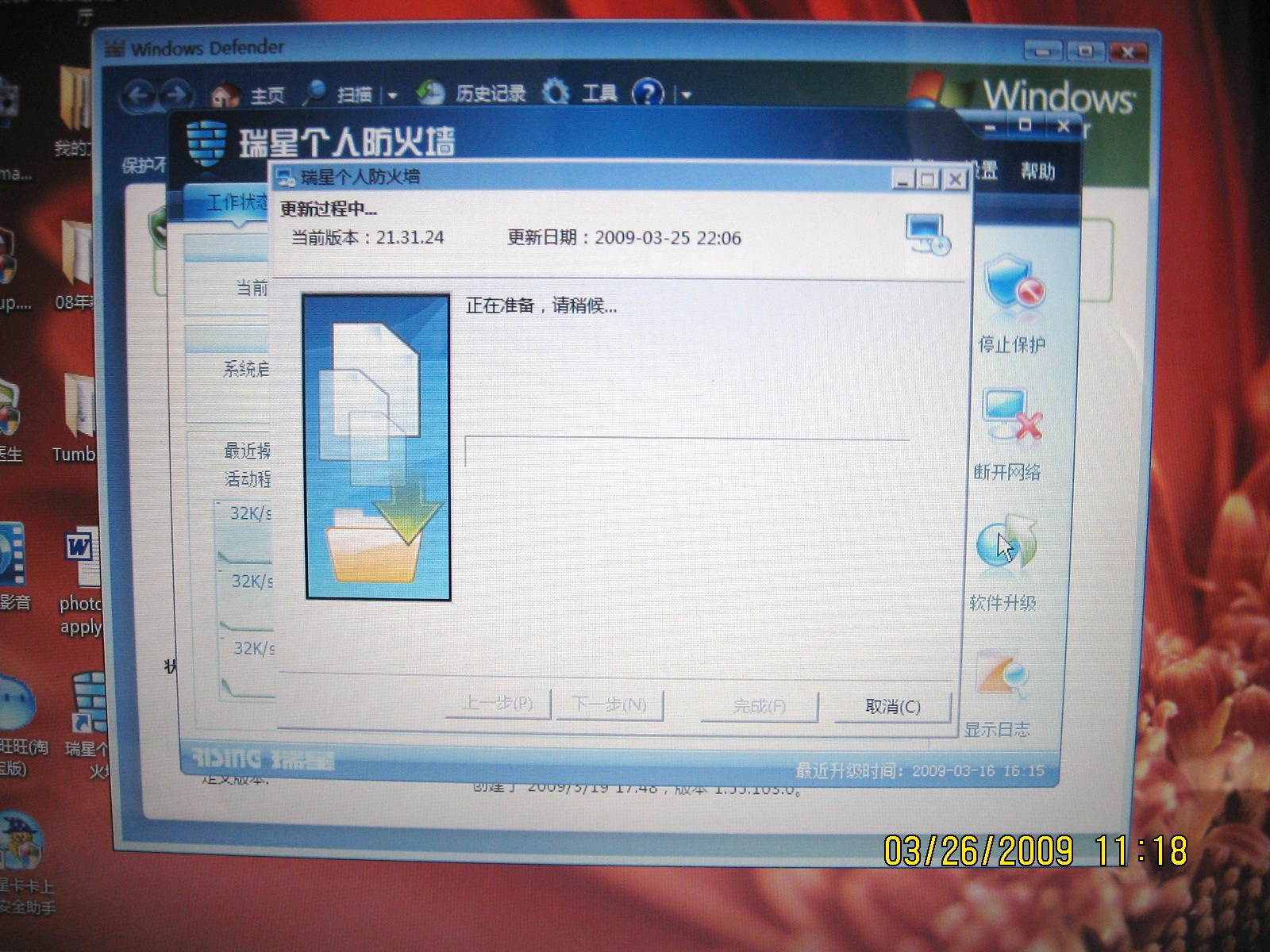 5,特别说一下09版杀毒软件,安装后按系统提示重启,出现“欢迎”两字后,有3种情况出现:“安装中。。。”或是“更新中。。。”或者是“全蓝屏“,然后电脑就无响应了,我只有重启进入安全系统。