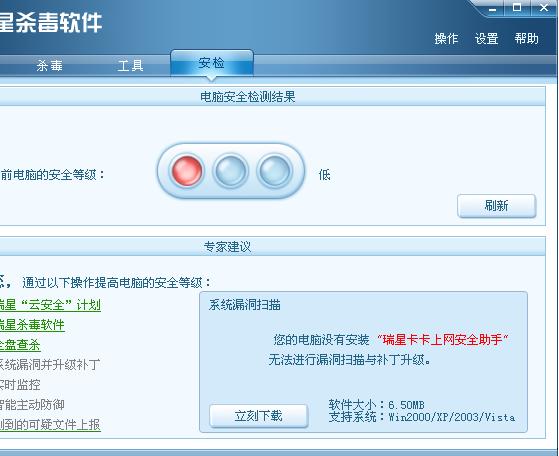 我今天刚做的系统,系统盘和其它盘绝对无毒,因为所有的盘我都格式化了的,重装瑞星升级到最新后先杀了一通毒,杀毒显示无毒,于是安装卡卡,岂不知出来一个对话框: