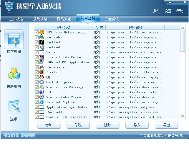 请问,此版本为什么没有 软件及应用程序访问网络 规则设置呢? 本人用的是原版瑞星程序,从这里官网下载!现可升级,监控也可全开!