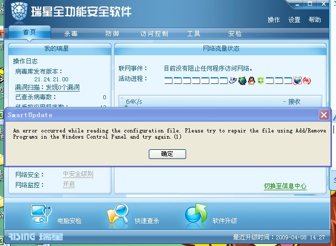 瑞星全功能安全软件间断出现不能升级的错误请求帮助