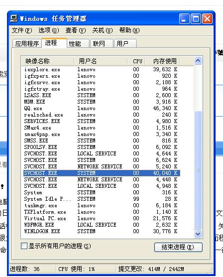 ,滑动鼠标中键屏幕竟自动放大缩小,跟看图片似的。关闭遨游后发现任务管理器中共有6个SVCHOST.EXE(大小写无误)进程,其中有2个用户是SYSTEM,其中一个占了很大内存,但与以前不同,无法手动结束(“拒绝访问”)