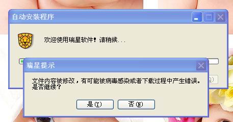 ”,按照提示发送短信成功获取序列号,然后再在官方网址下载了安装包,再点击安装时竟然安装不了,出现提示“文件内容被修改,有可能被病毒感染或者下载过程中产生错误,是否继续”,点击“是”后,就没有反应了,这怎么回事啊?