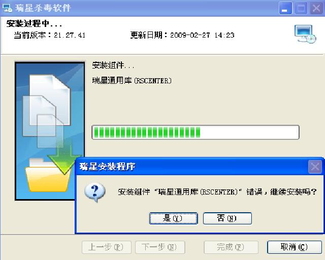出现安装程序错误,安装组件“瑞星通用库(RSCENR)”错误,继续安装吗?