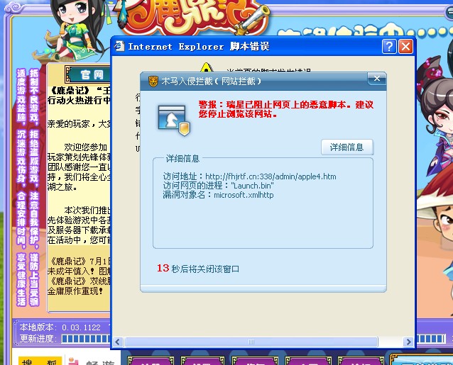 误报很多次,是测试版的网游鹿鼎记,很多人玩的。如果没误报请帮忙解决。我都不敢玩了,有时报木马有时不报。很多人玩的,请快点解决