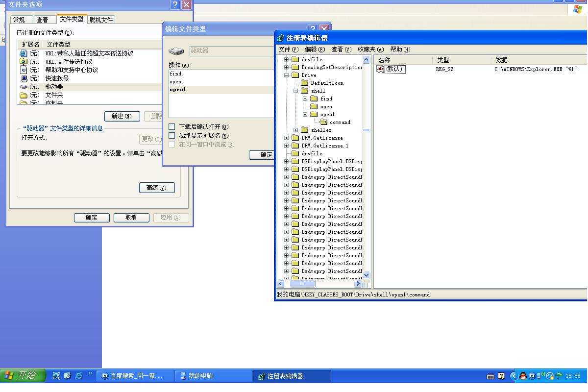 经过全盘杀毒和查杀木马后,电脑基本恢复正常了,但就是不能在同一窗口下打开文件夹和硬盘,注册表和文件夹选项都试过了,百度上有人说将open的键值改为none,也不行啊,高手们给织个招吧!(图中open1是首选项!)