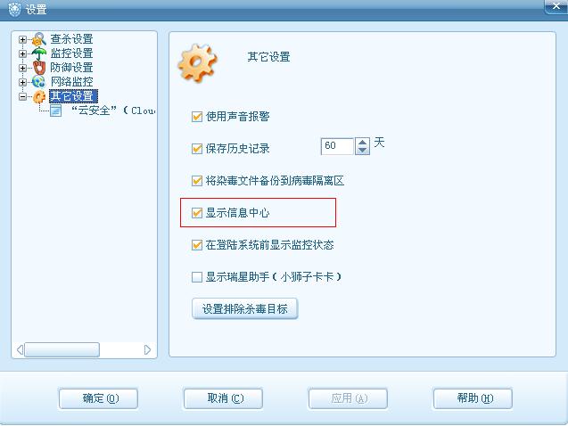 打开瑞星-设置-详细设置-其他设置-显示信息中心,把这个对勾打上后确定